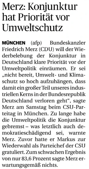 Und dann will Friedrich Merz "der Wiederbelebung der Konjunktur in Deutschland klare Priorität vor der Umweltpolitik einräumen"! Wie passt das denn zusammen?