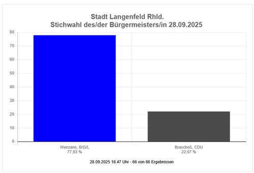 Die Wahlschlappe der CDU wird besonders deutlich in einer Übersicht des WDR: Ergebnisse für Langenfeld (Rheinland). Danach ist eine Stichwahl um das Bürgermeisteramt erforderlich. Hinsichtlich der Zusammensetzung des Rates hat die BGL die CDU überholt. Zu finden ist dort auch diese Übersicht über die Änderungen: