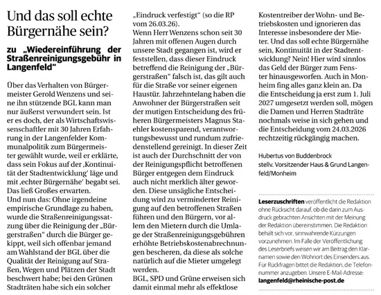 Ausgerechnet der stellvertrende Vorsitzende des Vereins Haus und Grund versteht den Sinn der Neuregelung nicht. Herr von Buddenbrock ist sich nicht zu schade, diesen Leserbrief zu veröffentlichen: