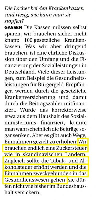 "Wissenschaftler wissen längst, welche Politik hilft, gesund zu bleiben. Andere Länder haben das erkannt und setzen die von der Forschung empfohlenen Maßnahmen mit Erfolg um. Dabei müssen es ja – Gott bewahre – gar keine Verbote sein, die außer den in dieser Hinsicht vernünftigen Grünen alle Parteien so scheuen. Es reichen schon Stellschrauben. So gibt es in Großbritannien längst eine Zuckersteuer."