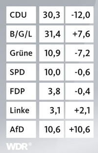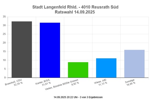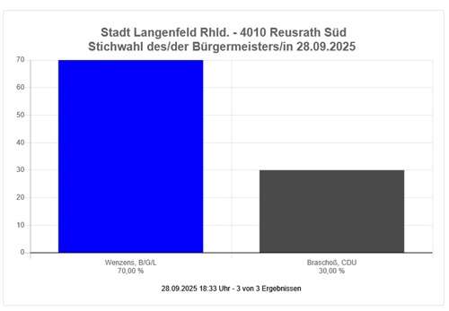 Die Wahlschlappe der CDU wird besonders deutlich in einer Übersicht des WDR: Ergebnisse für Langenfeld (Rheinland). Danach ist eine Stichwahl um das Bürgermeisteramt erforderlich. Hinsichtlich der Zusammensetzung des Rates hat die BGL die CDU überholt. Zu finden ist dort auch diese Übersicht über die Änderungen: